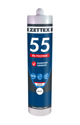 De Zettex MS 55 oplosmiddelvrije, elastische montagelijm . De MS 55 is ook te gebruiken als afdichtingsmiddel.